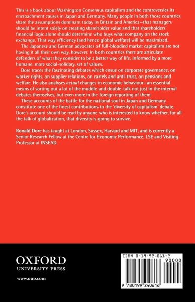 This is a book about Washington Consensus capitalism and the controversies its encroachment causes in Japan and Germany. Many people in both those countries share the assumptions dominant today in Britain and America-that managers should be intent solely on creating shareholder value and that shareholders' financial logic alone should determine who buys what company on the stock exchange. That way efficiency (and hence global welfare) will be maximized. The Japanese and German advocates of full-bloodied market capitalism are not having it all their own way, however. In both countries there are articulate defenders of what they consider to be a better way of life, informed by a more human, more social-solidary, set of values. Dore traces the fascinating debates which ensue on corporate governance, on worker rights, on supplier relations, on cartels and anti-trust, on pensions and welfare. He also analyses actual changes in economic behaviour-an essential means of sorting out a lot of the muddle and double-talk not just in the internal debates themselves, but even more in the foreign reporting of them. These accounts of the battle for the national soul in Japan and Germany constitute one of the finest contributions to the 'diversity of capitalism' debate. Dore's account should be read by anyone who is interested to know whether, for all the talk of globalization, that diversity is going to survive.