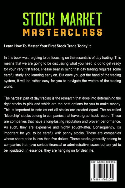 Learn How To Master Your First Stock Trade Today! In this book we are going to be focusing on the essentials of day trading. This means that we are going to be discussing what you need to do to get ready for your very first trade. Please bear in mind that day trading requires some careful study and learning early on. But once you get the hand of the trading system, it will be rather easy for you to navigate the waters of the trading world. The hardest part of day trading is the research that does into determining the right stocks to pick and which are the best options for you to make money. This is important to note as not all stocks are created equal. The so-called "blue chip" stocks belong to companies that have a great track record. These are companies that have a long-lasting reputation and proven performance. As such, they are expensive and highly sought-after. Consequently, it's important for you to be careful with penny stocks. These are companies whose share price is less than five dollars. These stocks generally belong to companies that have serious financial or administrative issues but are yet to be liquidated. In essence, they are hanging on for dear life. In This Book You Will Learn: ¿ Opening a New Brokerage Account ¿ Placing Your First Trades ¿ Best Time to Trade ¿ Golden Rules of Money Management ¿ Basic Technical Analysis Tools for Day Traders ¿ Using the moving average to enter and exit a trade ¿ Understanding the Fundamentals of Swing Trading ¿ The Difference Between Swing Trading and Day Trading ¿ Benefits and Drawbacks of Swing Trading ¿ Technical Analysis Tools Used in Swing Trading ¿ The Use of Charts and Graphs ¿ Use of Moving Average (MACD) ¿ The Head and Shoulders Pattern ¿ Triple Tops and Triple Bottoms ¿ Candlestick Analysis ¿ "Timing" entry and exit points ¿ Risk Management in Trading ¿ Protecting Yourself Against Risk ¿ Psychology in Trading ¿ Backtesting Strategies ¿ Characteristics of a Day Trader ¿ Day Trading as a Full-Time Career ¿ The Difference Between Day, Swing, and Position Trading ¿ Benefits of Day Trading ¿ Day Trading Equities ¿ Day Trading Options ¿ Day Trading FOREX ¿ Choosing the Best Stocks for Your Portfolio AND SO MUCH MORE! Let's Get You To Your Goals ASAP! Pick up your copy of the book right now by clicking the BUY NOW button at the top of this page!