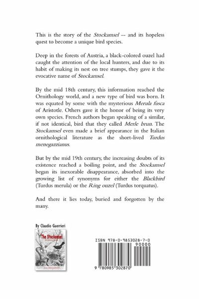 This is the story of the Stockamsel -- and its hopeless quest to become a unique bird species. Deep in the forests of Austria, a black-colored ouzel had caught the attention of the local hunters, and due to its habit of making its nest on tree stumps, they gave it the evocative name of Stockamsel. By the mid 18th century, this information reached the Ornithology world, and a new type of bird was born. It was equated by some with the mysterious Merula fusca of Aristotle. Others gave it the honor of being its very own species. French authors began speaking of a similar, if not identical, bird that they called Merle brun. The Stockamsel even made a brief appearance in the Italian ornithological literature as the short-lived Turdus menegazzianus. But by the mid 19th century, the increasing doubts of its existence reached a boiling point, and the Stockamsel began its inexorable disappearance, absorbed into the growing list of synonyms for either the Blackbird (Turdus merula) or the Ring ouzel (Turdus torquatus). And there it lies today, buried and forgotten by the many.