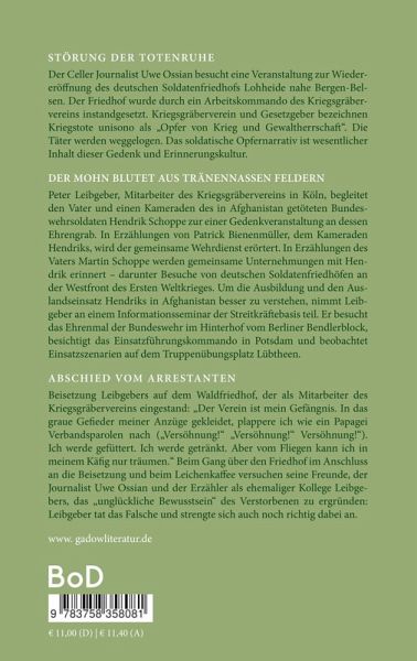 Störung der TotenruheDer Celler Journalist Uwe Ossian besucht eine Veranstaltung zur Wiedereröffnung des deutschen Soldatenfriedhofs Lohheide nahe Bergen-Belsen. Der Friedhof wurde durch ein Arbeitskommando des Kriegsgräbervereins instandgesetzt. Kriegsgräberverein und Gesetzgeber bezeichnen Kriegstote unisono als "Opfer von Krieg und Gewaltherrschaft". Die Täter werden weggelogen. Das soldatische Opfernarrativ ist wesentlicher Inhalt dieser Gedenk- und Erinnerungskultur.Der Mohn blutet aus tränennasen FeldernPeter Leibgeber, Mitarbeiter des Kriegsgräbervereins in Köln, begleitet den Vater und einen Kameraden des in Afghanistan getöteten Bundeswehrsoldaten Hendrik Schoppe zu einer Gedenkveranstaltung an dessen Ehrengrab. In Erzählungen von Patrick Bienenmüller, dem Kameraden Hendriks, wird der gemeinsame Wehrdienst erörtert. In Erzählungen des Vaters Martin Schoppe werden gemeinsame Unternehmungen mit Hendrik erinnert - darunter Besuche von deutschen Soldatenfriedhöfen an der Westfront des Ersten Weltkrieges. Um die Ausbildung und den Auslandseinsatz Hendriks in Afghanistan besser zu verstehen, nimmt Leibgeber an einem Informationsseminar der Streitkräftebasis teil. Er besucht das Ehrenmal der Bundeswehr im Hinterhof vom Berliner Bendlerblock, besichtigt das Einsatzführungskommando in Potsdam und beobachtet Einsatzszenarien auf dem Truppenübungsplatz Lübtheen.Abschied vom ArrestantenBeisetzung Leibgebers auf dem Waldfriedhof, der als Mitarbeiter des Kriegsgräbervereins eingestand: "Der Verein ist mein Gefängnis. In das graue Gefieder meiner Anzüge gekleidet, plappere ich wie ein Papagei Verbandsparolen nach ("Versöhnung!" "Versöhnung!" Versöhnung!"). Ich werde gefüttert. Ich werde getränkt. Aber vom Fliegen kann ich in meinem Käfig nur träumen." Beim Gang über den Friedhof im Anschluss an die Beisetzung und beim Leichenkaffee versuchen seine Freunde, der Journalist Uwe Ossian und der Erzähler als ehemaliger Kollege Leibgebers, das "unglückliche Bewusstsein" des Verstorbenen zu ergründen: Leibgeber tat das Falsche und strengte sich auch noch richtig dabei an.