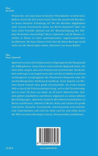 Wissen Sie, wie man dank versteckter Wurmlöcher in Schwimmbädern durch die Zeit reisen kann? Dass die ausufernde Bürokratie keine deutsche Erfindung ist? Wo die Marillen abgeblieben sind, warum französische Autos aus Berlin kommen? Oder wie man seine Freunde optimal mit der Beaufsichtigung des Telekom-Technikers beschäftigt?Henry Spietweh und JP Bouzac erzählen es Ihnen in einer unterhaltsamen, augenzwinkernden Erzählweise, die dazu führen wird, dass Sie dieses Buch gar nicht mehr aus der Hand legen wollen. Illustriert von Anna Rother.