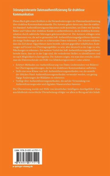 Dieses Buch gibt einen Einblick in die Herausforderungen der Datenauthentifizierung über drahtlose Kommunikationskanäle. Die Autoren gehen davon aus, dass die etablierten Standard-Authentifizierungsmechanismen nicht ausreichen, um Daten wie Sprache, Bilder und Videos über drahtlose Kanäle zu authentifizieren, da die drahtlose Kommunikation durch zahlreiche Störungen gekennzeichnet ist. Die Autoren schlagen neue Mechanismen vor, die auf so genannten Soft-Authentifizierungsalgorithmen basieren, die einige Änderungen an den zu schützenden Daten tolerieren. Die Autoren erklären, dass das Ziel dieser Algorithmen darin besteht, tolerant gegenüber inhaltlichen Änderungen auf Grund von Übertragungsfehler zu sein, aber dennoch in der Lage zu sein, Fälschungen zu erkennen. Ein weiterer Vorteil der Soft-Authentifizierungsalgorithmen besteht darin, dass sie in der Lage sind, die veränderten Stellen zu identifizieren und sie nach Möglichkeit zu korrigieren. Die Autoren zeigen, wie man dies erreicht, indem man die Datenmerkmale mit Hilfe von fehlerkorrigierenden Codes schützt.