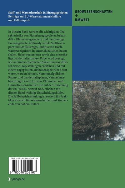 Kleineinzugsgebiete.- Pedologische und geomorphologische Bedingungen und Prozessdynamik in Wassereinzugsgebieten: Bedeutung für den Gewasserschutz im Lichte der EU-Wasserrahmenrichtlinie.- Lateraler Wasserflufß in Hangsedimenten unter Wald.- Wasser- und Stoffbilanzen kleiner Einzugsgebiete im Schwarzwald und Osterzgebirge - Einfliisse sich verändernder atmosphärischer Einträge und forstlicher Bewirtschaftung.- Abflussdynamik.- Untersuchungen zur Abflussdynamik in Einzugsgebieten.- Raum-zeitliche Untersuchung von Trockenwetter-Abflusskomponenten in einem heterogenen Einzugsgebiet.- Abflussdynamik und Stotfftransport - Methodische Aspekte der Datenerhebung zur Stofffrachtberechnung in Gewässereinzugsgebieten am Beispiel der Weida, Sachsen-Anhalt.- Hochwasserereignisse in unterschiedlichen Raumskalen - eine Untersuchung des gelösten und partikulären Stofftransports in heterogenen Einzugsgebieten.- Einzugsgebiete auf der Mesoskala.- Die EU-Wasserrahmenrichtlinie in ihrer Bedeutung für die Forschung zu mesoskaligen Einzugsgebieten.- Standortdifferenzierte Abschätzung von Sickerwasserraten in einem planungsrelevanten Maßstab - Regionale Betrachtungen des Bodenwasserhaushaltes.- Mesoskalige Landschaftsanalyse auf Basis von Untersuchungen des LandschaftshaushaItes: Probleme und hierarchische Losungsansatze am Beispiel von Flusseinzugsgebieten.- Diffuse und punktuelle Stiekstoffausträge in die Gewässer der mittleren Mulde.- Stichwortverzeichnis.- Die Autoren.