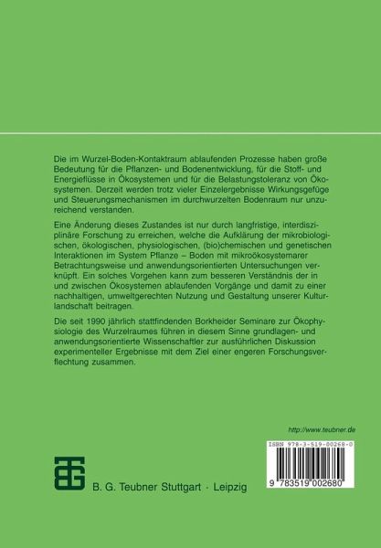 1 Wurzelwachstum und Wurzelphysiologie.- Veränderungen im Zuckergehalt der Wurzeln von Feuchtwiesengräsern unter osmotischem Streß.- Die Reaktion von Fichtenwurzeln auf Aluminium-Behandlung in Hydrokultur.- 2 Stoffumsatz und Stoffaufnahme durch Pflanzenwurzeln.- Eiseninaktivierung und Eisenmobilisierung im Wurzelapoplasten von Helianthus annuus und Zea mays.- Phosphateffizienz von vier Weizengenotypen (Triticum aestivum L.) des CIMMYT (Mexiko).- Aufnahme von ?-HCH durch Lolium perenne L..- Einfluß von Pestiziden auf die Wasseraufnahme, den N-Entzug und den Trockenmasseertrag von Mais.- Wurzelwasseraufnahme eines Kiefernwaldes unterhalb der hydraulischen Wasserscheide (Berlin - Grunewald).- Wurzelerneuerung bei Wintergerste und ihre Bedeutung für die P-Versorgung.- Agronomische Maßnahmen zur Reduzierung der Cadmiumaufnahme bei Salat (Lactuca sativa L.).- Anpassung von Mais (Zea mays L.) an Bodensalinität: Strategien und Konzepte.- 3 Wurzelabscheidungen - Beeinflußbarkeit und Funktionen.- Beziehungen zwischen pH-Wert, Sulfat- und Nitratkonzentrationen und der Arylsulfatase-Aktivität in der Rhizosphäre.- Untersuchung der Wurzelexsudation nach unterschiedlicher Eisen- und Kupferversorgung am Beispiel von Lupinus albus L..- Abgabe von 15N an den Boden durch intakter Weizenpflanzen in der gesamten Vegetationsperiode.- Die räumliche Verteilung der Abgabe von Wurzelabscheidungen von Raps- und Maispflanzen.- Wurzelabscheidungen in Böden und deren Auswirkung auf die Phosphatmobilisierung.- Induktion von Symptomen der Bodenmüdigkeit bei Apfelsämlingen im Gefäßversuch.- 4 Mikroben-Wurzel-Interaktionen.- Einfluß der P-Ernährung und der Applikation P-lösender Bakterien auf die funktionelle Diversität der Rhizosphärenmikroflora von Mais.- Einfluß derMykorrhiza (Glomus mosseae) auf die Freisetzung spezifisch gebundenen NH4+ in einer Gley-Braunerde.- Einfluß bakterieller Mikroorganismen auf die Wurzelmorphologie der Tomate unter Pathogeneinwirkung.- Wachstum von Mykorrhiza- und Nichtmykorrhiza-Strategen auf nährstoffarmen Bergbauböden nach Inokulation mit arbuskulären Mykorrhizapilzen.- Untersuchungen zur Charakterisierung der Pathogenität von Isolaten des Gaeumannomyces/Phialophora-Komplexes mittels pflanzlicher Peroxidasen.- 5 Stoffumsatz im System Pflanze - Boden.- Untersuchungen zum Einfluß von Röhrichtpflanzen auf N-Umsetzungsprozesse in Niedermoorböden.- Charakterisierung abiotischer Wechselwirkungen von organischen Schadstoffen mit Rhizosphärenkomponenten in Pflanzenkläranlagen.- Verläufe substratinduzierter Bodenatmung in Wurzelkernen von Acker- und Grünlandpflanzen und ihre Modifikation durch organische und anorganische Stickstoffquellen.- Bodenbildung auf Löß durch Wurzelrückstände landwirtschaftlicher Nutzpflanzen in Abhängigkeit von der mineralischen Düngung.- Quantifizierung der Kohlenstoffumsetzungsprozesse im System Pflanze - Niedermoor: Einfluß von Pflanzenart und Bodenvernässung.- Decrease of humus decomposition during growth of Lolium perenne - negative priming effect.- Abbauverhalten von Phragmites australis auf wiedervernäßten Niedermoorstandorten.- Verzeichnis der Teilnehmer.- Autorenregister.