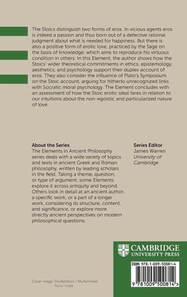 The Stoics distinguish two forms of eros. In vicious agents eros is indeed a passion and thus born out of a defective rational judgment about what is needed for happiness. But there is also a positive form of erotic love, practiced by the Sage on the basis of knowledge, which aims to reproduce his virtuous condition in others. In this Element, the author shows how the Stoics' wider theoretical commitments in ethics, epistemology, aesthetics, and psychology support their duplex account of eros. They also consider the influence of Plato's Symposium on the Stoic account, arguing for hitherto unrecognized links with Socratic moral psychology. The Element concludes with an assessment of how the Stoic erotic ideal fares in relation to our intuitions about the non-egoistic and particularized nature of love.