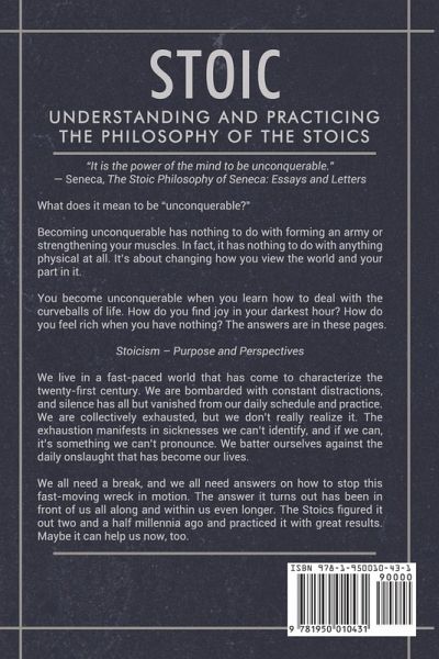 Stoicism - Understanding and Practicing the Philosophy of the Stoics "It is the power of the mind to be unconquerable." ¿ Seneca, The Stoic Philosophy of Seneca: Essays and Letters What does it mean to be "unconquerable?" Becoming unconquerable has nothing to do with forming an army or strengthening your muscles. In fact, it has nothing to do with anything physical at all. It's about changing how you view the world and your part in it. You become unconquerable when you learn how to deal with the curveballs of life. How do you find joy in your darkest hour? How do you feel rich when you have nothing? The answers are in these pages. You won't find these teachings in today's schools, but this is exactly what the ancient philosophers were teaching. Events outside of your control should have no impact on your joy, happiness, peace, or confidence. If these things are going to happen anyway, why not turn them into positive events? Instead of always being the victim, turn yourself into the victor. All it takes is a shift in perspective, and that's what Stoicism is all about. The timeless wisdom of the Stoics can help anyone find inner peace and joy and 'Stoicism - Understanding and Practicing the Philosophy of the Stoics' is the perfect starting point. Stoicism - Purpose and Perspectives We live in a fast-paced world that has come to characterize the twenty-first century. We are bombarded with constant distractions, and silence has all but vanished from our daily schedule and practice. We are collectively exhausted, but we don't really realize it. The exhaustion manifests in sicknesses we can't identify, and if we can, it's something we can't pronounce. We batter ourselves against the daily onslaught that has become our lives. We all need a break, and we all need answers on how to stop this fast-moving wreck in motion. The answer it turns out has been in front of us all along and within us even longer. The Stoics figured it out two and a half millennia ago and practiced it with great results. Maybe it can help us now too. Stoicism has two aspects-the theory and the academics of it, and wanting to read the texts that fall into that category is a good thing, but this is not that. This book is about how one practices Stoicism in their daily life here and now. It is for this century, this decade. Is the solution here? No. The solution is within each of us. What you will find here, though, is the way to extract the solution that is already within you. It's as simple as that. What are you waiting for? If you're looking for true, unbreakable joy and strength, scroll up and click the Buy Now button to get started!