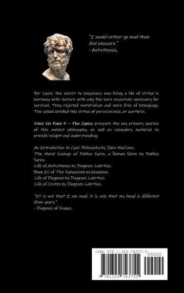 Stoic Six Pack 5 - The Cynics presents the key primary sources of this ancient philosophy, as well as secondary material to provide insight and understanding: An Introduction to Cynic Philosophy by John MacCunn, The Moral Sayings of Publius Syrus, a Roman Slave by Publius Syrus, Life of Antisthenes by Diogenes Laërtius, Book IV of The Symposium by Xenophon, Life of Diogenes by Diogenes Laërtius and Life of Crates by Diogenes Laërtius.