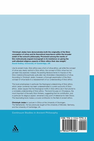 Like its ancient rivals, Stoic ethics was a form of virtue ethics, yet while the concept of virtue was clearly central to Stoic ethics, the concept of Stoic virtue has not yet been fully explored. Instead, the existing literature tends to impose on the Stoic material philosophically quite alien non-Aristotelian interpretations of virtue. According to Christoph Jedan, however, a thorough examination of the Stoic concept of virtue leads to a reassessment of our understanding of Stoic ethics. This book emphasises in particular the theological underpinning of Stoic ethics, which Jedan contends has been underestimated in current accounts of Stoic ethics. Jedan argues that the theological motifs in Stoic ethics are in fact pivotal to a complete understanding of Stoic ethics. The book focuses on Chrysippus, the most important of the early Stoic thinkers, suggesting that his contribution, and in particular its religious aspect, remained a key point of reference for later Stoics. This fascinating book makes a crucial contribution to the field of ancient ethics.