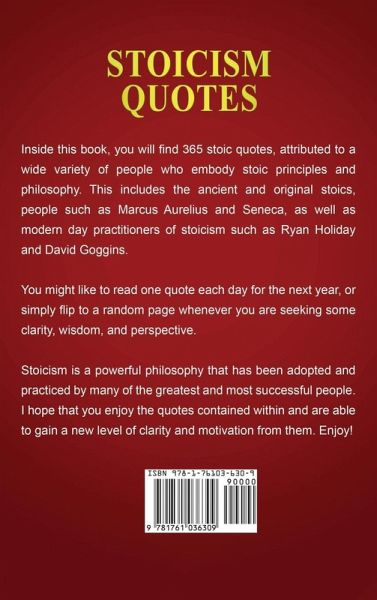 STOICISM QUOTES ¿Inside this book, you will find 365 stoic quotes, attributed to a wide variety of people who embody stoic principles and philosophy. This includes the ancient and original stoics, people such as Marcus Aurelius and Seneca, as well as modern day practitioners of stoicism such as Ryan Holiday and David Goggins. You might like to read one quote each day for the next year, or simply flip to a random page whenever you are seeking some clarity, wisdom, and perspective. Stoicism is a powerful philosophy that has been adopted and practiced by many of the greatest and most successful people. I hope that you enjoy the quotes contained within and are able to gain a new level of clarity and motivation from them. Enjoy!