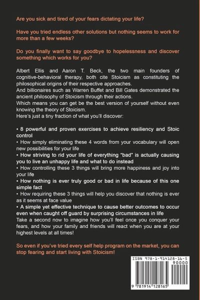 Are you sick and tired of your fears dictating your life? Have you tried endless other solutions but nothing seems to work for more than a few weeks? Do you finally want to say goodbye to hopelessness and discover something which works for you? Albert Ellis and Aaron T. Beck, the two main founders of cognitive-behavioral therapy, both cite Stoicism as constituting the philosophical origins of their respective approaches. And billionaires such as Warren Buffet and Bill Gates demonstrated the ancient philosophy of Stoicism through their actions. Which means you can get be the best version of yourself without even knowing the theory of Stoicism. Here's just a tiny fraction of what you'll discover: · 8 powerful and proven exercises to achieve resiliency and Stoic control · How simply eliminating these 4 words from your vocabulary will open new possibilities for your life · How striving to rid your life of everything "bad" is actually causing you to live an unhappy life and what to do instead · How controlling these 3 things will bring more happiness and joy into your life · How nothing is ever truly good or bad in life because of this one simple fact · How requiring these 3 things will help you discover that nothing is ever as it seems at face value · A simple yet effective technique to cause better outcomes to occur even when caught off guard by surprising circumstances in life Take a second now to imagine how you'll feel once you conquer your fears, and how your family and friends will react when you are at your highest levels at all times! So even if you've tried every self help program on the market, you can stop fearing and start living with Stoicism!