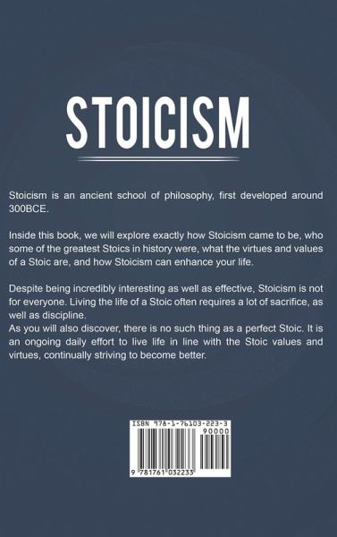 STOICISM Stoicism is an ancient school of philosophy, first developed around 300BCE. Inside this book, we will explore exactly how Stoicism came to be, some of the greatest Stoics in history, what the virtues and values of a Stoic are, and how Stoicism can enhance your life. Despite being incredibly interesting as well as effective, Stoicism is not for everyone. Living the life of a Stoic often requires a lot of sacrifice, as well as discipline. As you will also discover, there is no such thing as a perfect Stoic. It is an ongoing daily effort to live life in line with the Stoic values and…mehr