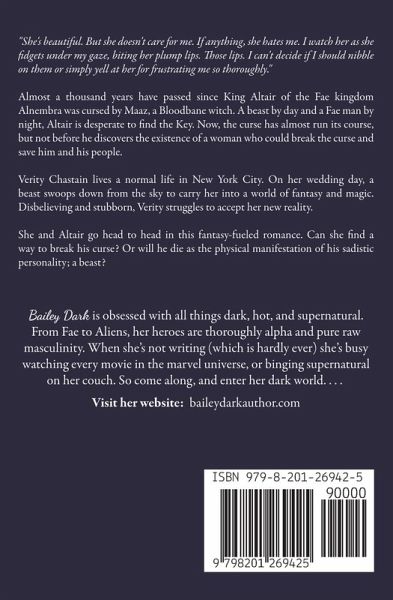 "She's beautiful. But she doesn't care for me. If anything, she hates me. I watch her as she fidgets under my gaze, biting her plump lips. Those lips. I can't decide if I should nibble on them or simply yell at her for frustrating me so thoroughly." Almost a thousand years have passed since King Altair of the Fae kingdom Alnembra was cursed by Maaz, a Bloodbane witch. A beast by day and a Fae man by night, Altair is desperate to find the Key. Now, the curse has almost run its course, but not before he discovers the existence of a woman who could break the curse and save him and his people. Verity Chastain lives a normal life in New York City. On her wedding day, a beast swoops down from the sky to carry her into a world of fantasy and magic. Disbelieving and stubborn, Verity struggles to accept her new reality. She and Altair go head to head in this fantasy-fueled romance. Can she find a way to break his curse? Or will he die as the physical manifestation of his sadistic personality; a beast? STOLEN BY THE FAE KING is the first book in the MATED TO THE FAE KING SERIES by author Bailey Dark. This is a Fae Romance for Adults. If you LOVE steaming hot paranormal romance and fantasy romance, SCROLL UP AND ONE CLICK NOW!