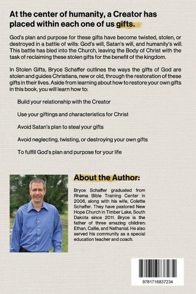 God's plan and purpose for these gifts have become twisted, stolen, or destroyed in a battle of wills: God's will, Satan's will, and humanity's will. This battle has bled into the Church, leaving the Body of Christ with the task of reclaiming these stolen gifts for the benefit of the kingdom. In Stolen Gifts, Bryce Schaffer outlines the ways the gifts of God are stolen and guides Christians, new or old, through the restoration of these gifts in their lives. Aside from learning about how to restore your own gifts in this book, you will learn how to: Build your relationship with the Creator, Use your giftings and characteristics for Christ, Avoid Satan's plan to steal your gifts, Avoid neglecting, twisting, or destroying your own gifts, To fulfill God's plan and purpose for your life