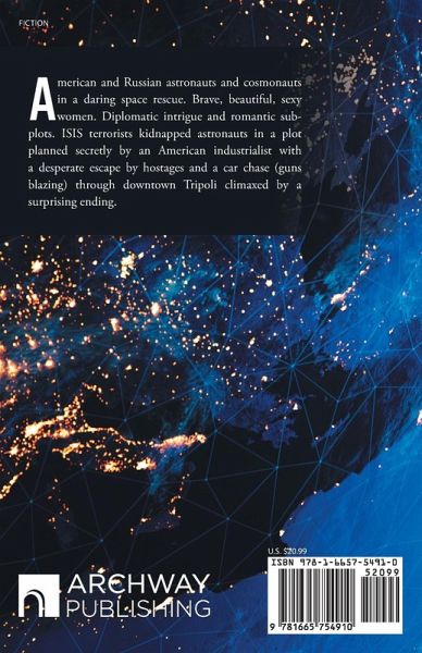 American and Russian astronauts and cosmonauts in a daring space rescue. Brave, beautiful, sexy women. Diplomatic intrigue and romantic sub-plots. ISIS terrorists kidnapped astronauts in a plot planned secretly by an American industrialist with a desperate escape by hostages and a car chase (guns blazing) through downtown Tripoli climaxed by a surprising ending.