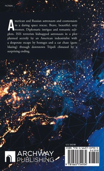 American and Russian astronauts and cosmonauts in a daring space rescue. Brave, beautiful, sexy women. Diplomatic intrigue and romantic sub-plots. ISIS terrorists kidnapped astronauts in a plot planned secretly by an American industrialist with a desperate escape by hostages and a car chase (guns blazing) through downtown Tripoli climaxed by a surprising ending.