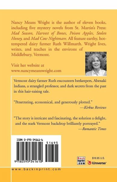 Vermont dairy farmer Ruth encounters beekeepers, Abenaki Indians, a strangled professor, and dark secrets from the past in this hair-raising tale. "Penetrating, economical, and generously plotted." --Kirkus Reviews "The story is intricate and fascinating, the solution a delight, and the stark Vermont backdrop brilliantly portrayed." --Romantic Times
