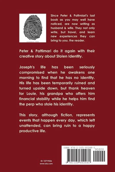 Pattimari & Peter do it again with this story about Stolen Identity. Joseph's life is turned upside down when he discovers that his Identity has been stolen, but thank heaven for Grandpa Louie who offers him financial assistance and helps him find the thief who nearly destroyed his life. This story, although fiction, represents events that happen every day which, left unattended, can bring ruin to a happy productive life.
