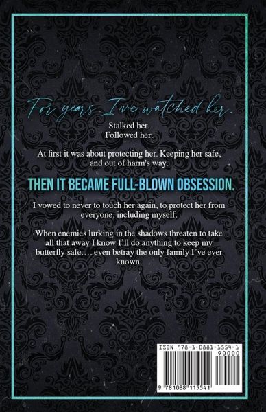 When I was a little girl, I thought the world of him. Then he showed the dark monster lurking beneath. For years I've watched her. Stalked her. Followed her. At first it was about protecting her. Keeping her safe, and out of harm's way. Then it became full-blown obsession. I vowed to never to touch her again, to protect her from everyone, including myself. When enemies lurking in the shadows threaten to take all that away I know I'll do anything to keep my butterfly safe.... even betray the only family I've ever known. **This is a complete full length standalone dark romance. Please be advised it contains mature themes, and sexual situations."