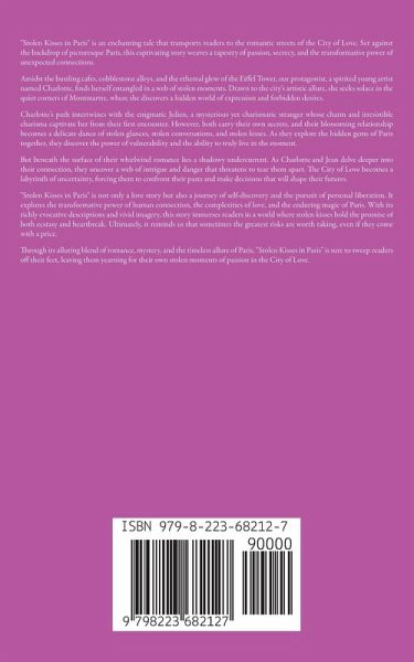 "Stolen Kisses in Paris" is an enchanting tale that transports readers to the romantic streets of the City of Love. Set against the backdrop of picturesque Paris, this captivating story weaves a tapestry of passion, secrecy, and the transformative power of unexpected connections. Amidst the bustling cafes, cobblestone alleys, and the ethereal glow of the Eiffel Tower, our protagonist, a spirited young artist named Emilie, finds herself entangled in a web of stolen moments. Drawn to the city's artistic allure, she seeks solace in the quiet corners of Montmartre, where she discovers a hidden world of expression and forbidden desires. Emilie's path intertwines with the enigmatic Julien, a mysterious yet charismatic stranger whose charm and irresistible charisma captivate her from their first encounter. However, both carry their own secrets, and their blossoming relationship becomes a delicate dance of stolen glances, stolen conversations, and stolen kisses. As they explore the hidden gems of Paris together, they discover the power of vulnerability and the ability to truly live in the moment. But beneath the surface of their whirlwind romance lies a shadowy undercurrent. As Emilie and Julien delve deeper into their connection, they uncover a web of intrigue and danger that threatens to tear them apart. The City of Love becomes a labyrinth of uncertainty, forcing them to confront their pasts and make decisions that will shape their futures. "Stolen Kisses in Paris" is not only a love story but also a journey of self-discovery and the pursuit of personal liberation. It explores the transformative power of human connection, the complexities of love, and the enduring magic of Paris. With its richly evocative descriptions and vivid imagery, this story immerses readers in a world where stolen kisses hold the promise of both ecstasy and heartbreak. Ultimately, it reminds us that sometimes the greatest risks are worth taking, even if they come with a price. Through its alluring blend of romance, mystery, and the timeless allure of Paris, "Stolen Kisses in Paris" is sure to sweep readers off their feet, leaving them yearning for their own stolen moments of passion in the City of Love.