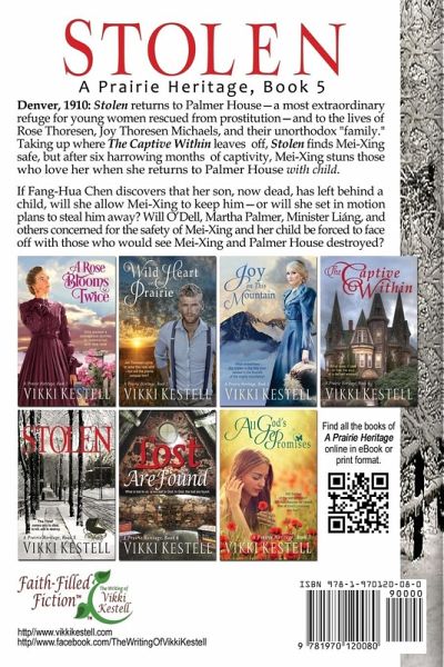 Denver, 1910: Stolen returns to Denver and Palmer House—a most extraordinary refuge for young women rescued from prostitution—and to the lives of Rose Thoresen, Joy Thoresen Michaels, and their unorthodox "family." Taking up where The Captive Within leaves off, Stolen finds Mei-Xing safe, but after six harrowing months of captivity, Mei-Xing stuns those who love her when she returns to Palmer House with child. If Su-Chong’s mother, Fang-Hua Chen, discovers that her son, now dead, has left behind a child, will she allow Mei-Xing to keep him—or will she set in motion plans to steal him away? Will O’Dell, Martha Palmer, Minister Liáng, and others concerned for the safety of Mei-Xing and her child be forced to face off with those who would see Mei-Xing and the work of Palmer House destroyed? A Prairie Heritage: Book 1: A Rose Blooms Twice Book 2: Wild Heart on the Prairie Book 3: Joy on This Mountain Book 4: The Captive Within Book 5: Stolen Book 6: Lost Are Found Book 7: All God’s Promises Book 8: The Heart of Joy (A Short Story) eBook only "Vikki writes the kind of faith-filled fiction that hooks you within the first few pages, will not let you go until you have finished, and leaves you wishing for more." —Janis Braun, Seattle, Washington "Her books are not just for 'chicks'! I was amazed how engrossed I became in the lives of Vikki's characters, and how much I could relate to their situations." —Ed Dunne, Los Angeles "Be prepared to put life on hold. That's all I have to say!" —Rebecca H., New Jersey "You will laugh, you will cry but, most of all, you will be uplifted." —LaTisha Holland, St. Augustine, FL