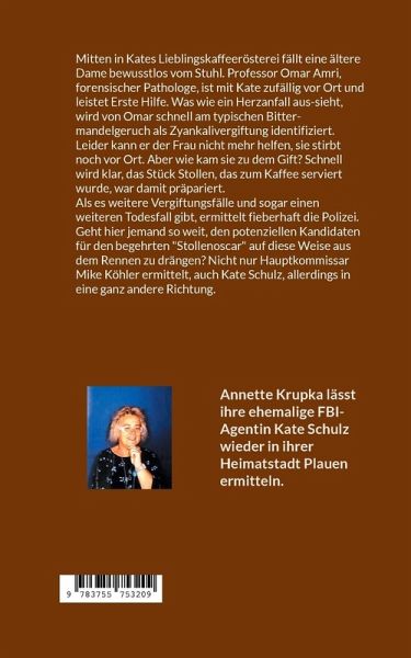 Mitten in Kates Lieblingskaffeerösterei fällt eine ältere Dame bewusstlos vom Stuhl. Professor Omar Amri, forensischer Pathologe, ist mit Kate zufällig vor Ort und leistet Erste Hilfe. Was wie ein Herzanfall aus-sieht, wird von Omar schnell am typischen Bitter-mandelgeruch als Zyankalivergiftung identifiziert. Leider kann er der Frau nicht mehr helfen, sie stirbt noch vor Ort. Aber wie kam sie zu dem Gift? Schnell wird klar, das Stück Stollen, das zum Kaffee serviert wurde, war damit präpariert. Als es weitere Vergiftungsfälle und sogar einen weiteren Todesfall gibt, ermittelt fieberhaft die Polizei. Geht hier jemand so weit, den potenziellen Kandidaten für den begehrten "Stollenoscar" auf diese Weise aus dem Rennen zu drängen? Nicht nur Hauptkommissar Mike Köhler ermittelt, auch Kate Schulz, allerdings in eine ganz andere Richtung.