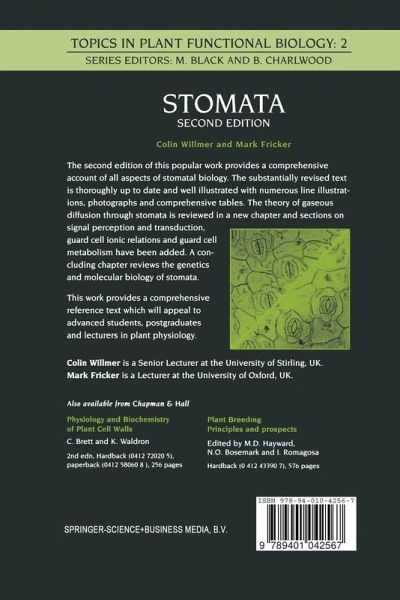 The book could be recommended for advanced students and specialists in plant physiology, biology, agriculture and related disciplines. - Acta Physiological Plantarium; Overall, the changes that the authors have made in this new edition of Stomata mark the book's successful transition from being a handbook of stomatal research to an essential textbook of stomatal physiology. I have no hesitation in recommending it, and anticipate that in future years it will become a standard text for scholars of both plant and stomatal physiology - Trends in Plant Science; Reviews of the first edition:; This paperback is, in general, well written and easy to read, especially an as introductory text for students ... A service to plant physiology has been well performed. This reviewer commends this little book as being a `window upon the soul' of stomata ... - Journal of Experimental Botany; [Willmer] gives a highly readable, excellently illustrated account of the distribution, anatomy, structure and development of guard cells ... I know of no other review of the structural aspects of this range and elegance - Times Higher Educational Supplement; Dr Willmer has produced a neat, crisply written monograph which will serve up to first degree level in all plant sciences for a good while to come - The Biologist