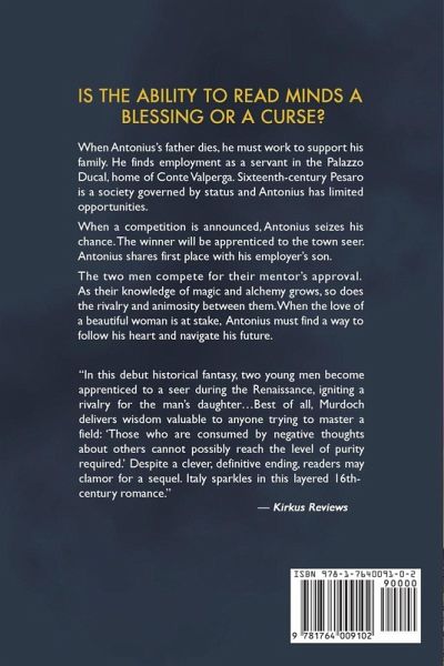 Is the ability to read minds a blessing or a curse? When Antonius's father dies, he must work to support his family. He finds employment as a servant in the Palazzo Ducal, home of Conte Valperga. Sixteenth-century Pesaro is a society governed by status, and Antonius has limited opportunities. When a competition is announced, Antonius seizes his chance. The winner will be apprenticed to the town seer. Antonius shares first place with his employer's son. The two men compete for their mentor's approval. As their knowledge of magic and alchemy grows, so does the rivalry and animosity between them. When the love of a beautiful woman is at stake, Antonius must find a way to follow his heart and navigate his future.