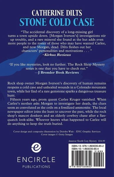 A field trip ends in disaster when Morgan Iverson falls down a gulley and into a cold case. She wants to learn enough geology to keep the family rock shop in business, but suddenly the only knowledge she needs is how to survive a night in the mountains. Finding shelter, Morgan stumbles onto a Sasquatch look-alike, and worse, human remains. Fifteen years ago, prom queen Carlee Kruger vanished from the small Colorado town. Carlee's mother Gerda, an alcoholic auto mechanic, asks Morgan to investigate her daughter's death. Morgan lost her husband two years ago, and she and her adult children are finally finding healing. Morgan realizes Gerda may never recover unless she learns what happened to Carlee. When newspaper editor Kurt Willard offers to help, he seems as interested in Morgan as in the cold case. The rock shop's two donkeys sound the alarm when the man resembling Sasquatch lurks around their barn. The police want to question Sasquatch, but he eludes everyone. Then Morgan finds a rare fossil gemstone where she discovered Carlee's remains - their first solid clue. Word leaks out to the prospecting community, sparking a dangerous treasure hunt. As Morgan and Kurt follow clues as convoluted as the coils on a fossilized ammonite, they suspect the person who knows what happened fifteen years ago will do anything to keep the truth buried. In book two of the Rock Shop Mystery series, amateur sleuth Morgan Iverson digs into gemstone prospecting to solve a Stone Cold Case.