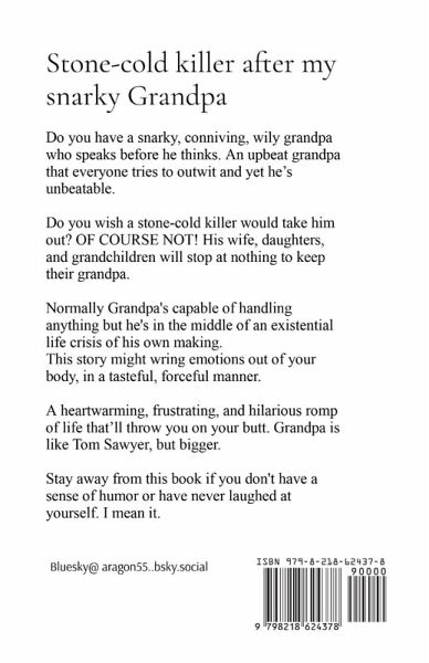 Do you have a snarky, conniving, wily grandpa who speaks before he thinks. An upbeat grandpa that everyone tries to outwit and yet he's unbeatable. Do you wish a stone-cold killer would take him out? OF COURSE NOT! His wife, daughters, and grandchildren will stop at nothing to keep their grandpa. Normally Grandpa's very capable to handle anything but he's in the middle of an existential life crisis of his own making. With this story, I might wring every emotion out of your body, in a tasteful, forceful way. A heartwarming, frustrating, and hilarious romp of life that'll throw you on your butt. Grandpa is like Tom Sawyer, but bigger. Stay away from this book if you don't have a sense of humor or have never laughed at yourself. I mean it.