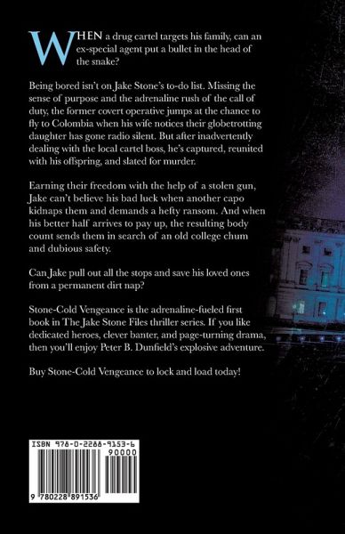 When a drug cartel targets his family, can an ex-special agent put a bullet in the head of the snake? Being bored isn't on Jake Stone's to-do list. Missing the sense of purpose and the adrenaline rush of the call of duty, the former covert operative jumps at the chance to fly to Colombia when his wife notices their globetrotting daughter has gone radio silent. But after inadvertently dealing with the local cartel boss, he's captured, reunited with his offspring, and slated for murder. Earning their freedom with the help of a stolen gun, Jake can't believe his bad luck when another capo kidnaps them and demands a hefty ransom. And when his better half arrives to pay up, the resulting body count sends them in search of an old college chum and dubious safety. Can Jake pull out all the stops and save his loved ones from a permanent dirt nap? Stone-Cold Vengeance is the adrenaline-fueled first book in The Jake Stone Files thriller series. If you like dedicated heroes, clever banter, and page-turning drama, then you'll enjoy Peter B Dunfield's explosive adventure. Buy Stone-Cold Vengeance to lock and load today!