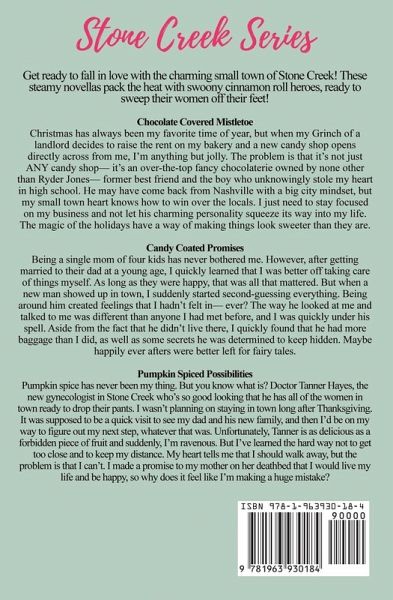 Get ready to fall in love with the charming small town of Stone Creek! These steamy novellas pack the heat with swoony cinnamon roll heroes, ready to sweep their women off their feet! Chocolate Covered Mistletoe Christmas has always been my favorite time of year, but when my Grinch of a landlord decides to raise the rent on my bakery and a new candy shop opens directly across from me, I'm anything but jolly. The problem is that it's not just ANY candy shop- it's an over-the-top fancy chocolaterie owned by none other than Ryder Jones- former best friend and the boy who unknowingly stole my heart in high school. He may have come back from Nashville with a big city mindset, but my small town heart knows how to win over the locals. I just need to stay focused on my business and not let his charming personality squeeze its way into my life. The magic of the holidays have a way of making things look sweeter than they are. Candy Coated Promises Being a single mom of four kids has never bothered me. However, after getting married to their dad at a young age, I quickly learned that I was better off taking care of things myself. As long as they were happy, that was all that mattered. But when a new man showed up in town, I suddenly started second-guessing everything. Being around him created feelings that I hadn't felt in- ever? The way he looked at me and talked to me was different than anyone I had met before, and I was quickly under his spell. Aside from the fact that he didn't live there, I quickly found that he had more baggage than I did, as well as some secrets he was determined to keep hidden. Maybe happily ever afters were better left for fairy tales. Pumpkin Spiced Possibilities Pumpkin spice has never been my thing. But you know what is? Doctor Tanner Hayes, the new gynecologist in Stone Creek who's so good looking that he has all of the women in town ready to drop their pants. I wasn't planning on staying in town long after Thanksgiving. It was supposed to be a quick visit to see my dad and his new family, and then I'd be on my way to figure out my next step, whatever that was. Unfortunately, Tanner is as delicious as a forbidden piece of fruit and suddenly, I'm ravenous. But I've learned the hard way not to get too close and to keep my distance. My heart tells me that I should walk away, but the problem is that I can't. I made a promise to my mother on her deathbed that I would live my life and be happy, so why does it feel like I'm making a huge mistake?