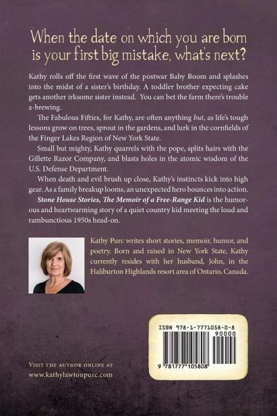 When the date on which you are born is your first big mistake, what's next? Kathy rolls off the first wave of the postwar Baby Boom and splashes into the midst of a sister's birthday. A toddler brother expecting cake gets another irksome sister instead. You can bet the farm there's trouble a-brewing. The Fabulous Fifties, for Kathy, are often anything but, as life's tough lessons grow on trees, sprout in the gardens, and lurk in the corn fields of the Finger Lakes Region of New York State. Small but mighty, Kathy quarrels with the pope, splits hairs with the Gillette Razor Company, and blasts holes in the atomic wisdom of the U.S. Defense Department. When death and evil brush up close, Kathy's instincts kick into high gear. As a family breakup looms, an unexpected hero bounces into action. Stone House Stories, The Memoir of a Free-Range Kid is the humorous and heartwarming story of a quiet country kid meeting the loud and rambunctious 1950s head-on.