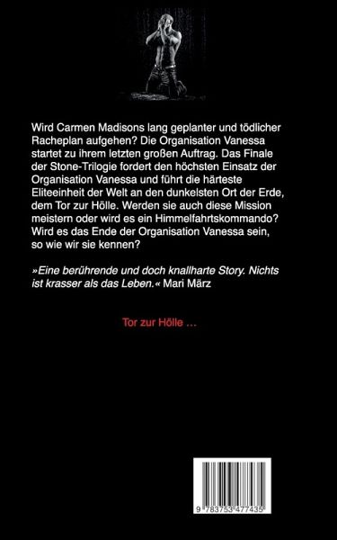 Wird Carmen Madisons lang geplanter und tödlicher Racheplan aufgehen?Die Organisation Vanessa startet zu ihrem letzten großen Auftrag.Das Finale der Stone-Trilogie fordert den höchsten Einsatz der Organisation Vanessa und führt die härteste Eliteeinheit der Welt an den dunkelsten Ort der Erde, dem Tor zur Hölle. Werden sie auch diese Mission meistern oder wird es ein Himmelfahrtskommando? Wird es das Ende der Organisation Vanessa sein, so wie wir sie kennen?