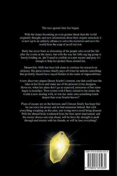 The race against time has begun.With the stones becoming an even greater threat than the world originally thought, and new information about their origins unlocked, it is now up to an unlikely alliance to solve the mysteries and save the world from the cusp of an all out war. Ruby has never been so distrusting of the people who saved her life after the events at the dance, but with the way her little rag tag group is barely holding on, she'll need to confide in a new master and pray it's enough to help her protect those around her. Meanwhile, Milli has been left alone to continue his research on alchemy. His perseverance finally pays off when he unlocks something that probably should have stayed hidden in the realm of impossibilities. A new discovery piques Queen Scarlet's interest, one that could turn the tides in her favor and make use of the prisoner in her dungeon. However, when her plans don't go as expected, memories of her sister begin to resurface. Were events with Cherry related to the stones the world is now dealing with, or was her sister onto something much deeper than even Scarlet knows? Plans of escape are on the horizon, and Crimson finally has hope that he can leave his prison and its bad memories behind. But with everything weighing on this plan, one wrong move could bring disaster. With his abused body weakened from his time spent imprisoned, and the enemy always one step ahead, will he have the strength to see push through and reunite with his friends, or will he lose everything?