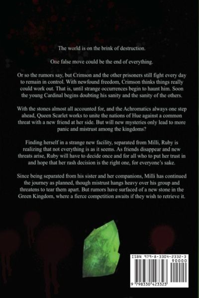 The world is on the brink of destruction. One false move could be the end of everything. Or so the rumors say, but Crimson and the other prisoners still fight every day to remain in control. With newfound freedom, Crimson thinks things really could work out. That is, until strange occurrences begin to haunt him. Soon the young Cardinal begins doubting his sanity and the sanity of the others. With the stones almost all accounted for, and the Achromatics always one step ahead, Queen Scarlet works to unite the nations of Hue against a common threat with a new friend at her side. But will new mysteries only lead to more panic and mistrust among the kingdoms? Finding herself in a strange new facility, separated from Milli, Ruby is realizing that not everything is as it seems. As friends disappear and new threats arise, Ruby will have to decide once and for all who to put her trust in and hope that her rash decision is the right one, for everyone's sake. Since being separated from his sister and her companions, Milli has continued the journey as planned, though mistrust hangs heavy over his group and threatens to tear them apart. But rumors have surfaced of a new stone in the Green Kingdom, where a fierce competition awaits if they wish to retrieve it.