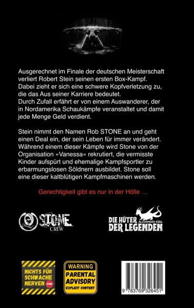 Ausgerechnet im Finale der deutschen Meisterschaft verliert Robert Stein seinen ersten Box-Kampf. Dabei zieht er sich eine schwere Kopfverletzung zu, die das Aus seiner Karriere bedeutet. Durch Zufall erfährt er von einem Auswanderer, der in Nordamerika Schaukämpfe veranstaltet und damit jede Menge Geld verdient. Stein nimmt den Namen Rob STONE an und geht einen Deal ein, der sein Leben für immer verändert. Während einem dieser Kämpfe wird Stone von der Organisation »Vanessa« rekrutiert, die vermisste Kinder aufspürt und ehemalige Kampfsportler zu erbarmungslosen Söldnern ausbildet. Stone soll…mehr