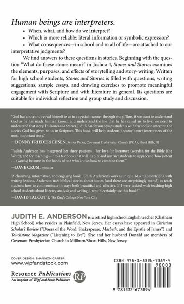 Human beings are interpreters. -When, what, and how do we interpret? -Which is more reliable: literal information or symbolic expression? -What consequences--in school and in all of life--are attached to our interpretative judgments? We find answers to these questions in stories. Beginning with the question ""What do these stones mean?"" in Joshua 4, Stones and Stories examines the elements, purposes, and effects of storytelling and story-writing. Written for high school students, Stones and Stories is filled with questions, writing suggestions, sample essays, and drawing exercises to promote meaningful engagement with Scripture and with literature in general. Its questions are suitable for individual reflection and group study and discussion.