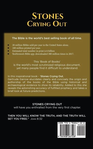 The Bible is the world's best selling book of all time.20 million Bibles sold per year in the United States alone. 100 million printed per year. Estimated total number in print is 6 billion YouVersion's Bible app, downloaded 300 million times in 2017. This 'Book of Books' is the world's most scrutinised religious document, yet many people find it difficult to understand. In this inspirational book - 'Stones Crying out, Gertrude Garrow elucidates clearly and concisely the origin and authorship of the books of the Bible using historical and archaeological evidence to show its reliability. Added to this, she reveals the astonishing accuracy of fulfilled prophecy and takes a brief look at future predictions.