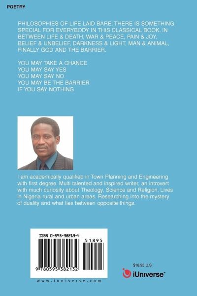 PHILOSOPHIES OF LIFE LAID BARE: THERE IS SOMETHING SPECIAL FOR EVERYBODY IN THIS CLASSICAL BOOK. IN BETWEEN LIFE & DEATH, WAR & PEACE, PAIN & JOY, BELIEF & UNBELIEF, DARKNESS & LIGHT, MAN & ANIMAL, FINALLY GOD AND THE BARRIER. YOU MAY TAKE A CHANCE YOU MAY SAY YES YOU MAY SAY NO YOU MAY BE THE BARRIER IF YOU SAY NOTHING