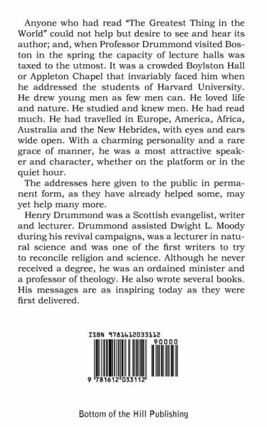 Anyone who had read "The Greatest Thing in the World" could not help but desire to see and hear its author; and, when Professor Drummond visited Boston in the spring of 1893, the capacity of lecture halls was taxed to the utmost. To accommodate thousands turned away, he repeated some of his lectures in the Lowell Institute Course, Boston. It was a crowded Boylston Hall or Appleton Chapel that invariably faced him when he addressed the students of Harvard University. He drew young men as few men can. He loved life and nature. He studied and knew men. He had read much. He had traveled in Europe, America, Africa, Australia and the New Hebrides, with eyes and ears wide open. With a charming personality and a rare grace of manner, he was a most attractive speaker and character, whether on the platform or in the quiet hour. The addresses here given to the public in permanent form for the first time, as they have already helped some, may yet help many more.