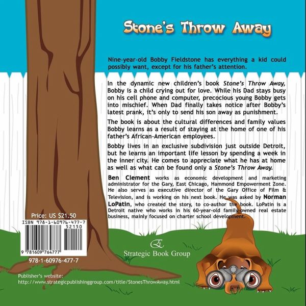 Nine-year-old Bobby Fieldstone has everything a kid could possibly want, except for his father's attention.In the dynamic new children's book Stone's Throw Away, Bobby is a child crying out for love. While his Dad stays busy on his cell phone and computer, precocious young Bobby gets into mischief. When Dad finally takes notice after Bobby's latest prank, it's only to send his son away as punishment. The book is about the cultural differences and family values Bobby learns as a result of staying at the home of one of his father's African-American employees. Bobby lives in an exclusive subdivision just outside Detroit, but he learns an important life lesson by spending a week in the inner city. He comes to appreciate what he has at home as well as what can be found only a Stone's Throw Away. Ben Clement works as economic development and marketing administrator for the Gary, East Chicago, Hammond Empowerment Zone. He also serves as executive director of the Gary Office of Film & Television, and is working on his next book. He was asked by Norman LoPatin, who created the story, to co-author the book. LoPatin is a Detroit native who works in his 60-year-old family-owned real estate business, mainly focused on charter school development.