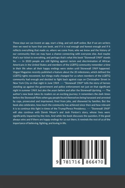 In 2020 people are still fighting against racism and discrimination of African Americans in the United States and members of the LGBTQ community remember a time in their life when all their happy endings were stolen until Stonewall 1969 happened. Vogue Magazine recently published a feature about the 20 milestones, which defined the LGBTQ rights movement, but things really changed for us when members of the LGBTQ community had enough and decided to fight back against cops on Christopher Street in New York City on that night in June 1969. "Stonewall 1969" tells the story of heroes standing up against the government and police enforcement not just on that significant night in summer 1969, but also the years before and after the Stonewall Uprising. The author's new book takes its readers on an exciting journey; it remembers the dark times before the Stonewall Riots when gay people found themselves being harassed and arrested by cops, prosecuted and imprisoned, fired from jobs, and disowned by families. But the book also celebrates, how much the community has achieved since then and how relevant it is to continue this fight in times of the Trump/Pence Presidency. "Stonewall 1969" will also continue with Derek Meyer's and Josh Fenton's story, whose lives were significantly impacted by the riots. And while the book discusses the question, if the good always wins and if there are happy endings for us out there, it reminds the rest of us of the importance of believing, fighting, and loving in life. What does "Stonewall 1969" make so special in these times when we can invent an app, start a blog, and sell stuff online. But if we are writers then we need to have that one book, and if it is real enough and honest enough and if it reflects everything that made us, where we come from, who we knew and the history of our community then we may have a chance connecting with everyone else. And maybe that's our ticket to everything, and perhaps that's what this book "Stonewall 1969" stands for.
