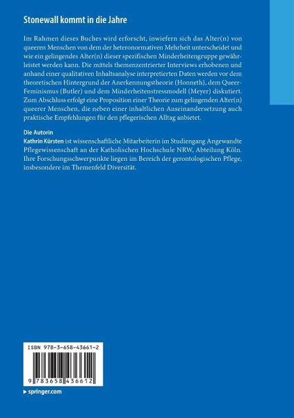 Im Rahmen dieses Buches wird erforscht, inwiefern sich das Alter(n) von queeren Menschen von dem der heteronormativen Mehrheit unterscheidet und wie ein gelingendes Alter(n) dieser spezifischen Minderheitengruppe gewährleistet werden kann. Die mittels themenzentrierter Interviews erhobenen und anhand einer qualitativen Inhaltsanalyse interpretierten Daten werden vor dem theoretischen Hintergrund der Anerkennungstheorie (Honneth), dem Queer-Feminismus (Butler) und dem Minderheitenstressmodell (Meyer) diskutiert. Zum Abschluss erfolgt eine Proposition einer Theorie zum gelingenden Alter(n) queerer Menschen, die neben einer inhaltlichen Auseinandersetzung auch praktische Empfehlungen für den pflegerischen Alltag anbietet.