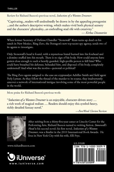 Review for Richard Beeson's previous novel, Seduction of a Wanton Dreamer: "Captivating...readers will undoubtedly be drawn in by the appealing protagonist...and the author's descriptive writing, which makes vivid both physical scenery and the characters' physicality...an enthralling read rife with creativity." - Kirkus Discoveries More praise for Richard Beeson's previous work: "Seduction of a Wanton Dreamer is an enjoyable, character-driven story ...a rich work of magical realism ... Readers should enjoy this symbol-heavy, richly detailed fantasy novel." -ForeWord Clarion Review When former Secretary of Defense Chandler "Stonewall" Kean turns up dead on his ranch in New Mexico, Ring Zero, the Pentagon's new top-secret spy agency, sends two of its agents to investigate. Only Stonewall's head is found, with a mysterious brand burned into his forehead and a domino stuffed into his mouth. There is no sign of his body. How could anyone have gotten close enough to such a heavily guarded, high-profile person to kill him? Who could have breached his defenses, beheaded him, and disposed of his body, completely undetected? And what was the motive-personal or political? The Ring Zero agents assigned to the case are cryptanalyst Achilles Smith and field agent Perly Lyman. As they follow the thread of the murder to its source, they inadvertently uncover a network of international intrigue involving some of the most powerful people in the world.