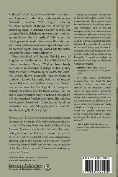 At the end of the 1830s the abolitionist sisters Sarah and Angelina Grimke, along with Angelina's new husband, Theodore Weld, begin collecting first-hand accounts of the horrors of slavery and publishing them in American Slavery as It Is. The success of the book helps to move northern opinion against slavery. But the birth of children and the challenges of domestic lives mean the sisters set aside their public roles as voices against slavery and for women's rights. Turning inward sets the sisters into painful conflict with each other. Teens Archibald and Francis Grimke, sons of Angelina and Sarah's brother, Henry Grimke and his colored mistress, Nancy Weston, have barely survived the unspeakable hardships of slavery. They make their way to freedom in the North, but education proves elusive. Eventually their excellence as students at Lincoln University leads to their surprising revelation to their abolitionist aunts. At Harvard Law and at Princeton Theological, the young men embark on difficult but illustrious careers. But the end of Reconstruction means a renewed struggle for African American freedom and rights. The romantic and domestic heartbreaks of Archie and Frank are intertwined with their lifelong struggle for the survival and equal rights of their people.
