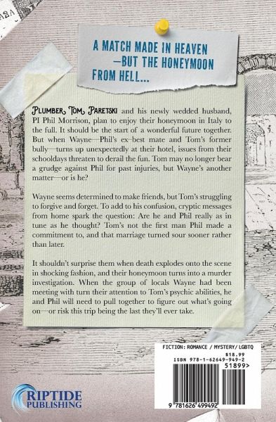 A match made in heaven-but the honeymoon from hell. Plumber Tom Paretski and his newly wedded husband, PI Phil Morrison, plan to enjoy their honeymoon in Italy to the full. It should be the start of a wonderful future together. But when Wayne-Phil's ex-best mate and Tom's former bully-turns up unexpectedly at their hotel, issues from their schooldays threaten to derail the fun. Tom may no longer bear a grudge against Phil for past injuries, but Wayne's another matter-or is he? Wayne seems determined to make friends, but Tom's struggling to forgive and forget. To add to his confusion, cryptic messages from home spark the question: Are he and Phil really as in tune as he thought? Tom's not the first man Phil made a commitment to, and that marriage turned sour sooner rather than later. It shouldn't surprise them when death explodes onto the scene in shocking fashion, and their honeymoon turns into a murder investigation. When the group of locals Wayne had been meeting with turn their attention to Tom's psychic abilities, he and Phil will need to pull together to figure out what's going on-or risk this trip being the last they'll ever take.