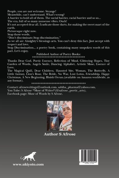 People, you are not welcome. Strange! Meanwhile, can't understand. What's wrong? A barrier to hold all of them. The social barrier, racial barrier and so so... The era, full of so many nonsense vibes. Ouch! It's not accepted dear all. Eradicate those darts, for making the sweet mart of the earth. Picturesque right now. Stop those words. "Don't discriminate.Stop discrimination." As we all are Almighty's blessings arts. You can't deny this fact. Just accept with respect and love. Stop Discrimination... a poetry book, containing many unspoken words of this part. Let's enjoy. P