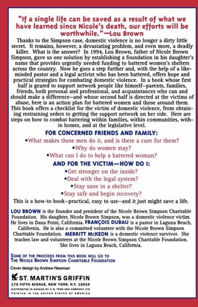 Thanks to the Simpson case, domestic violence is no longer a dirty little secret. It remains, however, a devastating problem, and even more, a deadly killer. What is the answer? In 1994, Lou Brown, father of Nicole Brown Simpson, gave us one solution by establishing a foundation in his daughter's name that provides urgently needed funding to battered women's shelters across the country. Now he goes a step further, and with the help of a like-minded pastor and a legal activist who has been battered, offers hope and practical strategies for combating domestic violence. In a book whose first half is geared to support network people like himself--parents, families, friends, both personal and professional, and acquaintances who can and should make a difference--and whose second half is directed at the victims of abuse, here is an action plan for battered women and those around them.. This book offers a checklist for the victim of domestic violence, from obtaining restraining orders to getting the support network on her side. Here are steps on how to combat battering within families, within communities, within homes and at the legislative level. For Concerned Friends and Family: What makes these men do it, and is there a cure for them? Why do women stay? What can I do to help a battered woman? And for the Victim--How do I: Get stronger on the inside? Deal with the legal system? Stay sane in a shelter? Stay save and begin recovery? This is a how-to book--practical, easy to use--and it just might save a life.