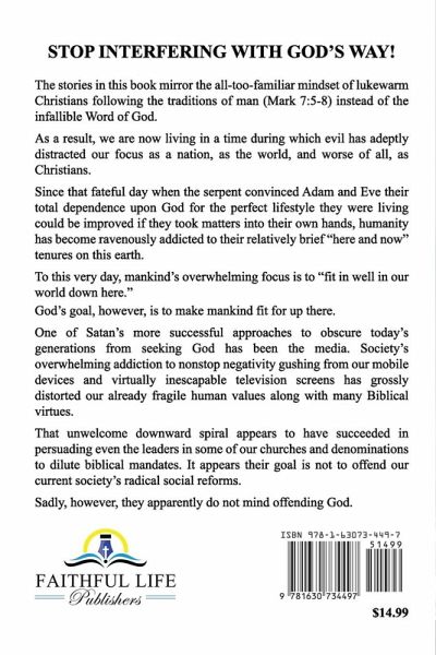 The stories in this book mirror the all-too-familiar mindset of lukewarm Christians following the traditions of man (Mark 7:5-8) instead of the infallible Word of God. As a result, we are now living in a time during which evil has adeptly distracted our focus as a nation, as the world, and, worse of all, as Christians. Since that fateful day when the serpent convinced Adam and Eve their total dependence upon God for the perfect lifestyle they were living could be improved if they took matters into their own hands, humanity has become ravenously addicted to their relatively brief "here and now" tenures on this earth. To this very day, mankind's overwhelming focus is to "fit in well in our world down here." God's goal, however, is to make mankind fit for up there. One of Satan's more successful approaches to obscure today's generations from seeking God has been the media. Society's overwhelming addiction to nonstop negativity gushing from our mobile devices and virtually inescapable television screens has grossly distorted our already fragile human values along with many Biblical virtues. That unwelcome downward spiral appears to have succeeded in persuading even the leaders in some of our churches and denominations to dilute biblical mandates. It appears their goal is not to offend our current society's radical social reforms. Sadly, however, they apparently do not mind offending God.
