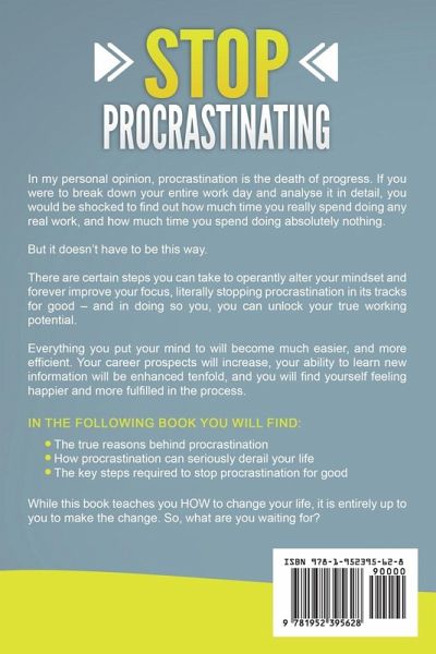 In my personal opinion, procrastination is the death of progress. If you were to break down your entire workday and analyze it in detail, you would be shocked to find out how much time you really spend doing any real work, and how much time you spend doing absolutely nothing. But it doesn't have to be this way. There are certain steps you can take to operantly alter your mindset and forever improve your focus, literally stopping procrastination in its tracks for good - and in doing so you, you can unlock your true working potential. Everything you put your mind to will become much easier, and more efficient. Your career prospects will increase, your ability to learn new information will be enhanced tenfold, and you will find yourself feeling happier and more fulfilled in the process. In the following book you will find: The true reasons behind procrastination How procrastination can seriously derail your life The key steps required to stop procrastination for good While this book teaches you HOW to change your life, it is entirely up to you to make the change. So, what are you waiting for?